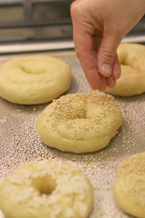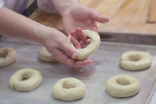 Utilizando as mãos e alguma pressão no processo, forme uma "corda" com cada uma das bolas de massa, com cerca de 20-25cm. (Se necessário, volte a humedecer a superfície com uma toalha de papel húmida para facilitar o trabalho). Pressione ligeiramente as extremidades da "corda" de forma a ficarem mais estreitas do que o resto. Coloque uma ponta da massa entre o polegar e o indicador e enrole a restante á volta da mão até que as extremidades se encontrem. Pressione com os dedos as pontas de forma a colarem e selarem. Tente igualar a largura da argola o melhor que puder e de forma a obter um buraco no centro com cerca de 5cm. Coloque os bagels no tabuleiro, pincele ligeiramente com óleo e leve ao frio de um dia para o outro.