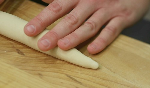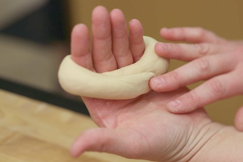 Retire a massa do frio e divida-a em 6-8 partes iguais. Forme uma bola com cada um dos pedaços, rolando-as numa superfície seca e limpa, com as mãos em forma de concha; não utilize nenhuma farinha neste processo. Se a massa deslizar na superfície e não formar uma bola, limpe a superfície com uma toalha de papel húmida e tente de novo.