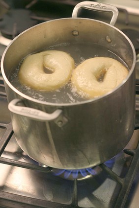 Retire os bagels do frio 90 mnts antes de os cozinhar. Encha uma panela larga com 3/4 de água (certifique-se de que a água tem pelo menos 10cm de profundidade), cubra com uma tampa e deixe que levante fervura. Quando finalmente estiver a ferver, adicione a restante c.chá de sal e o bicarbonato de soda, reduza o lume e deixe ferver um pouco com a tampa.