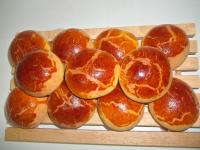 "Espiga" .Faça bolas pequenas e coloque-as num tabuleiro de forno polvilhado com farinha. Pincele a superfície com gema de ovo e leve a forno pré-aquecido a 50°C durante 20 minutos, para que dobre de volume. Quando dobrar de volume, aumente a temperatura para 180°C cerca de 25 minutos.