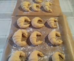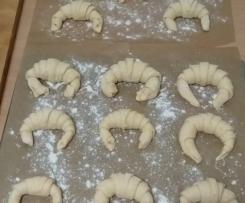 - Após a ultima levedação, numa taça colocar duas gemas com uma colher de chá de leite, mexer e pincelar cada croissant com a mistura. Levar a cozer em forno pré-aquecido a 200ºC até ficarem dourados. Retirar do forno e deixar arrefecer sobre uma rede.