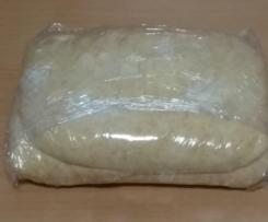 - Untar uma caixa com tampa com azeite. Deitar a massa na caixa com a ajuda da espátula, tapar e deixar levedar até dobrar de tamanho. O tempo depende muito da temperatura ambiente, se estiver quente leveda mais rápido, se estiver frio a levedação é mais lenta.