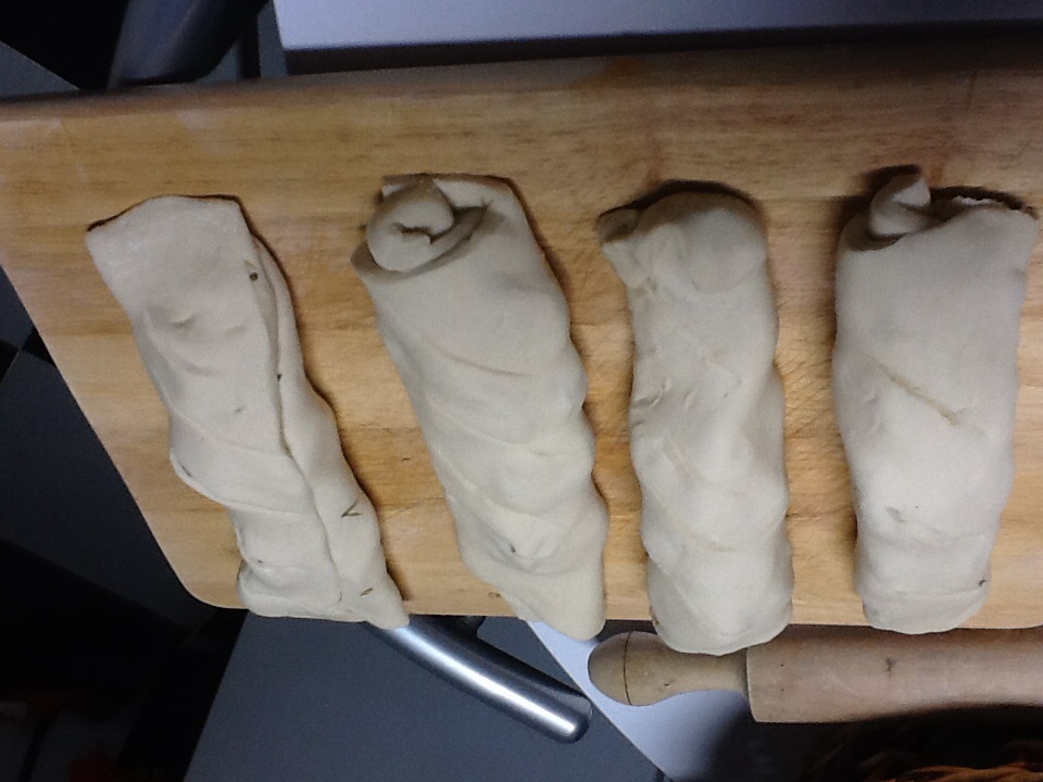 Enrolar a massa de modo a dar forma ao pão e dar pequenos golpes na superfície e deixar levedar 30m