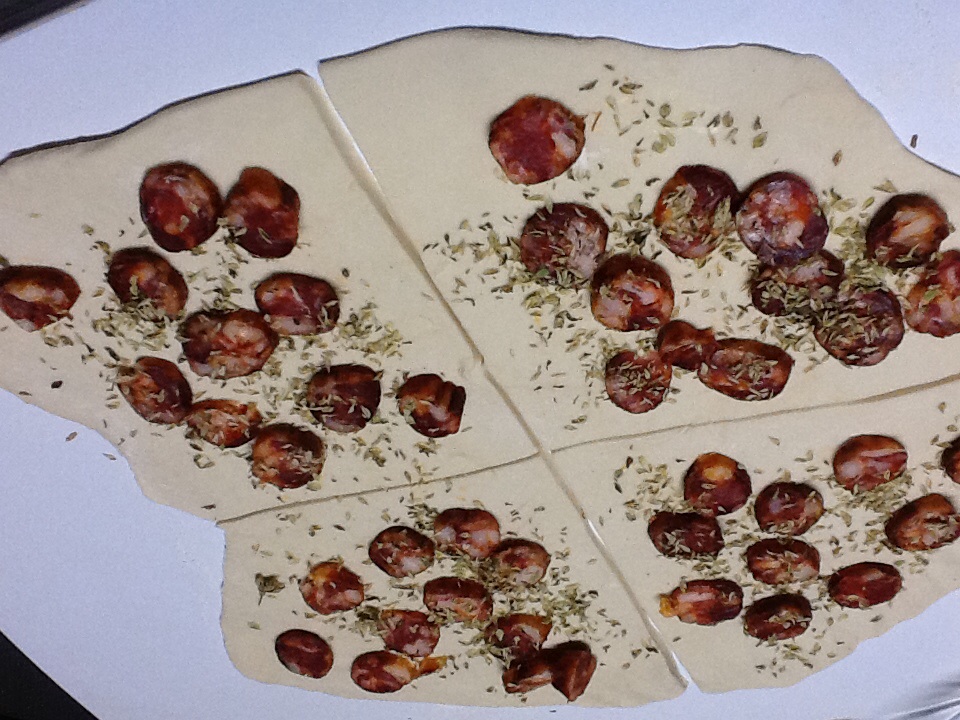 Estender a massa e cortar em 4 partes, por cima dispôr as rodelas de linguiça e polvilhar com orégãos.