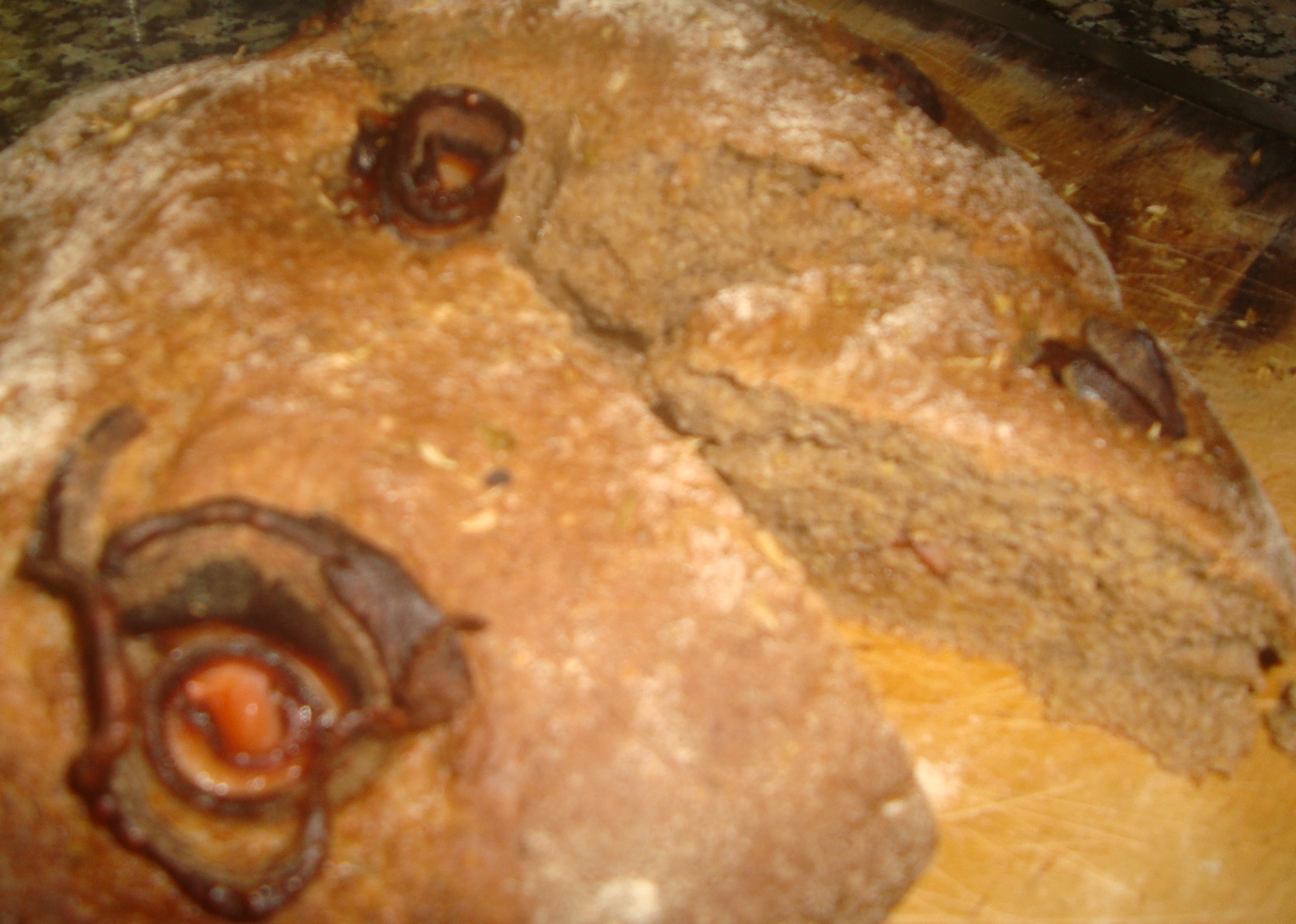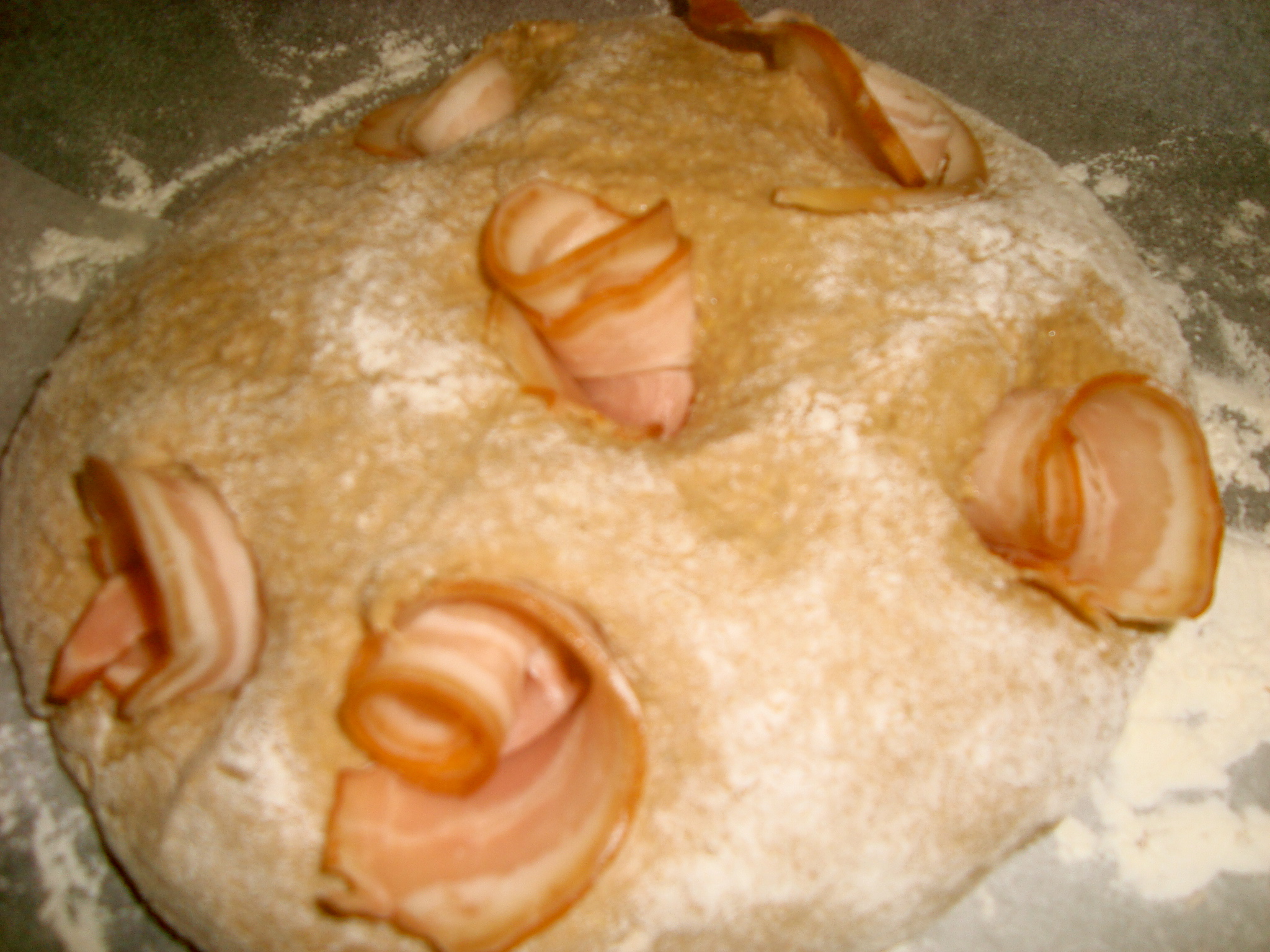 "Espiga" . deixe levedar em local sem correntes de ar (o forno por exemplo tapado com um pano e muito amor). Apos levedar formar uma bola simpáctica e enrolar as fatias de bacon em forma de rosa e enfiar na bola de modo a criar algo bonito,cozer no forno a 220º ate estar pronto, cerca de 30min, antes de desligar o forno, bate na parte de baixo do pão (lar) se fizer eco, está pronto! Bom apetite.