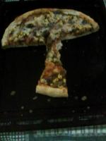 Há umas semanas atras andei por aqui à procura de uma pizza para o jantar e encontrei esta receita. Agradou-me e como tal pus a mão na massa. Ficou mesmo muito, muito boa. Acontece que como não como carne fi-la utilizando os mesmos ingredientes mas dividindo, metade sem carne e a outra metade com. Quando a tirei do frono fiquei um bocadinho na duvida qual era a minha e a do meu marido. Fui cortando, cortando e no final tinhamos esta pizza. Fartámo-nos de rir com o enorme