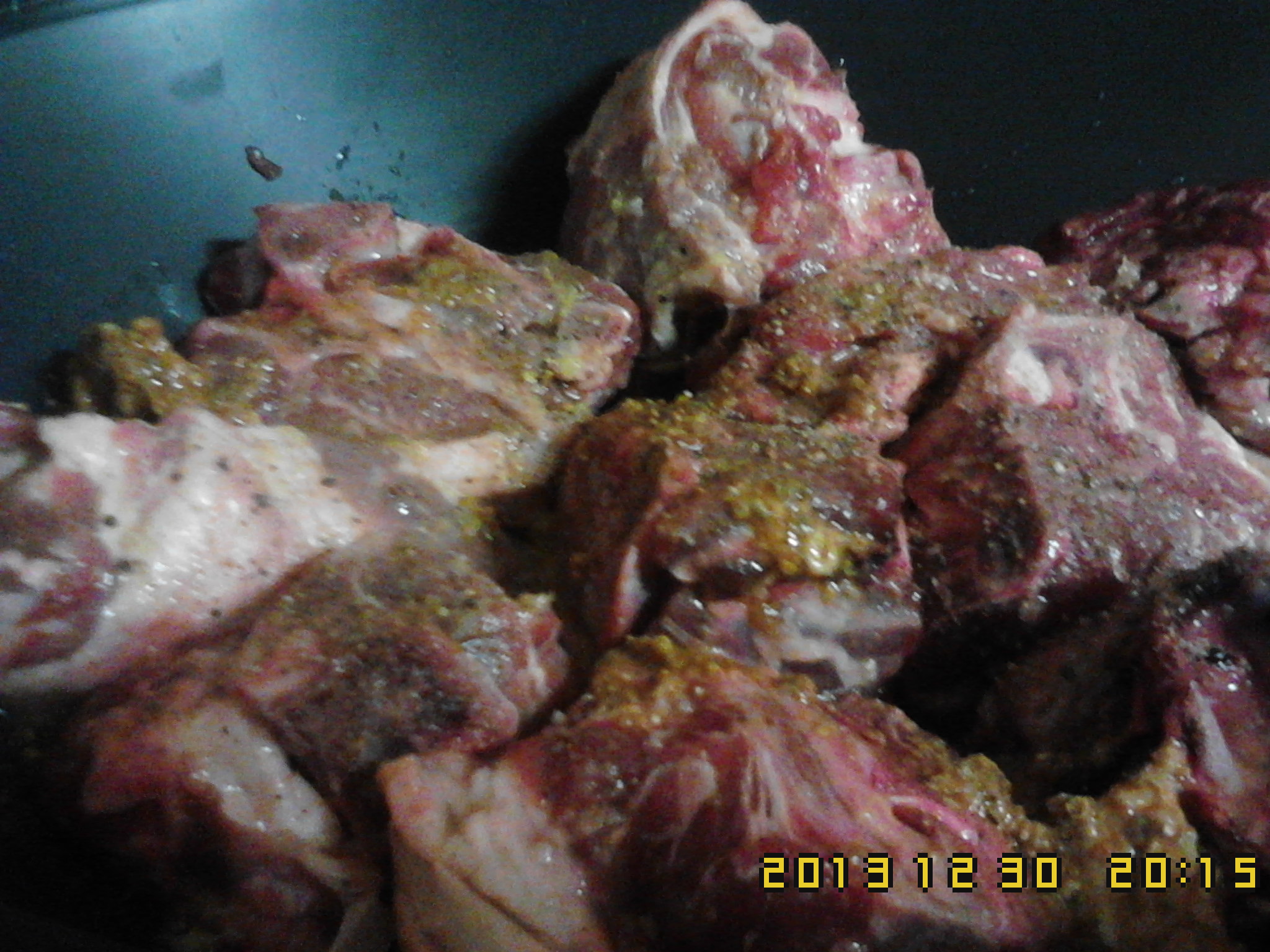 3) Na varoma,coloque a folha de loiro ,com o borrego,partido em cima com sal,jalpur de manga(axan de manga).A seguir,ponha o sumo de laranja e de limão em cima do borrego.