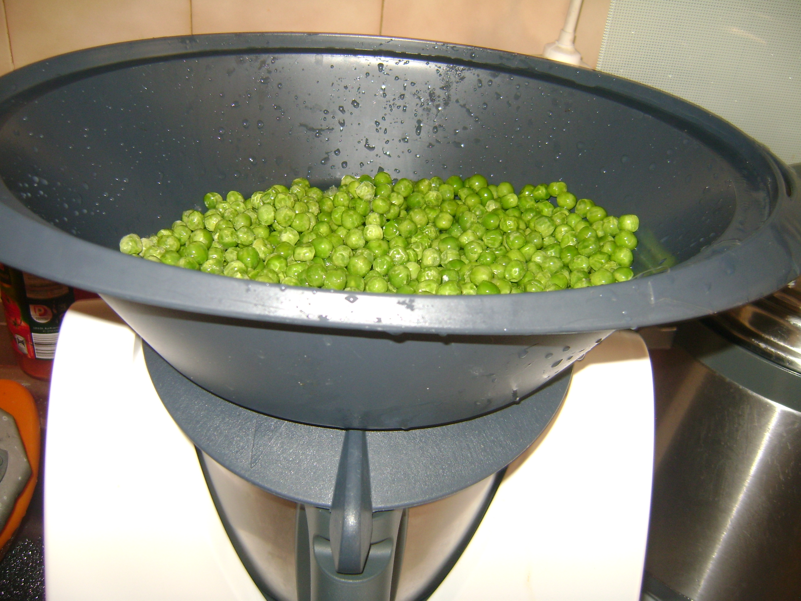 coloca a varoma por cima e deita dentro as ervilhas não coloquei sal.