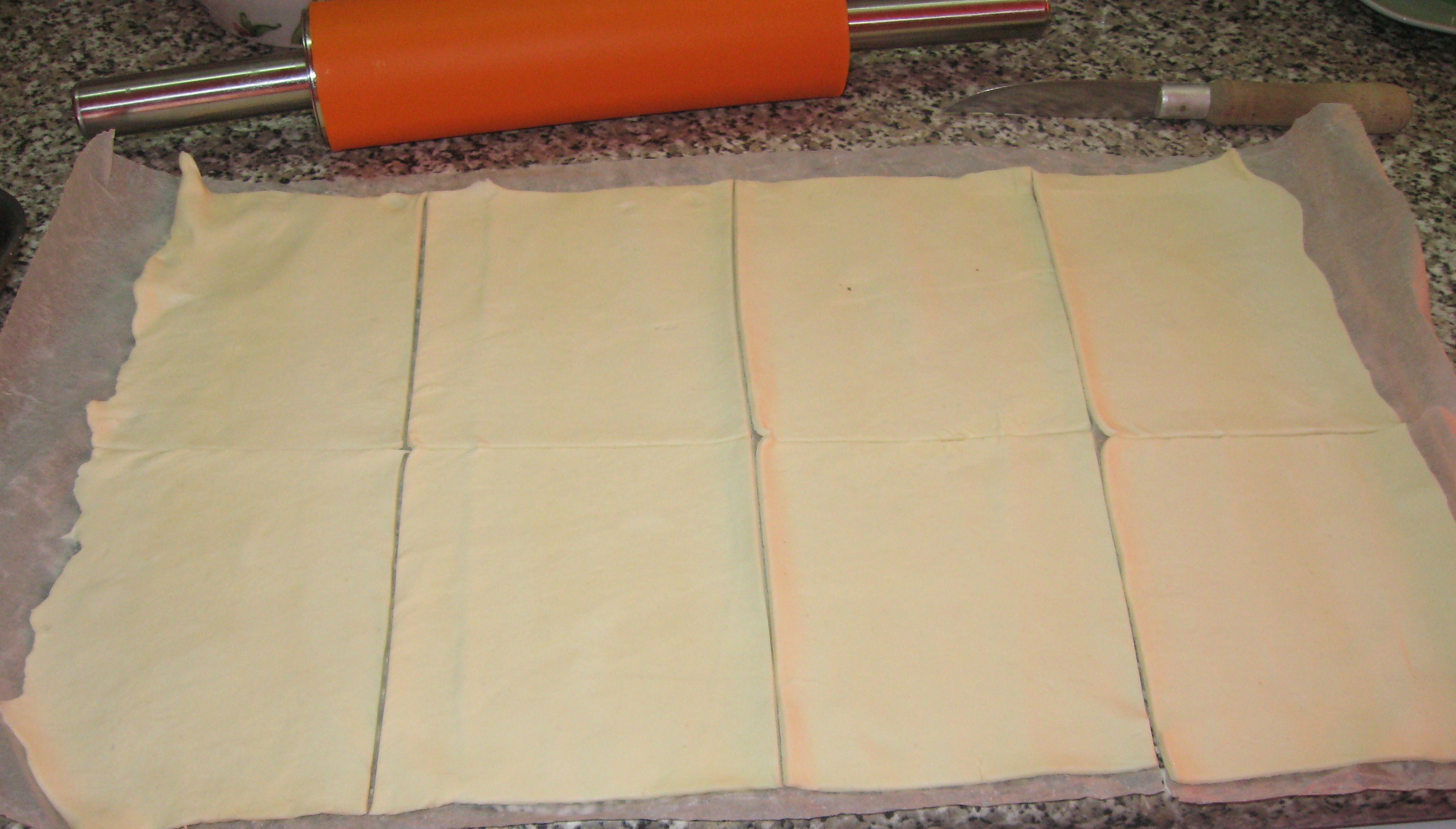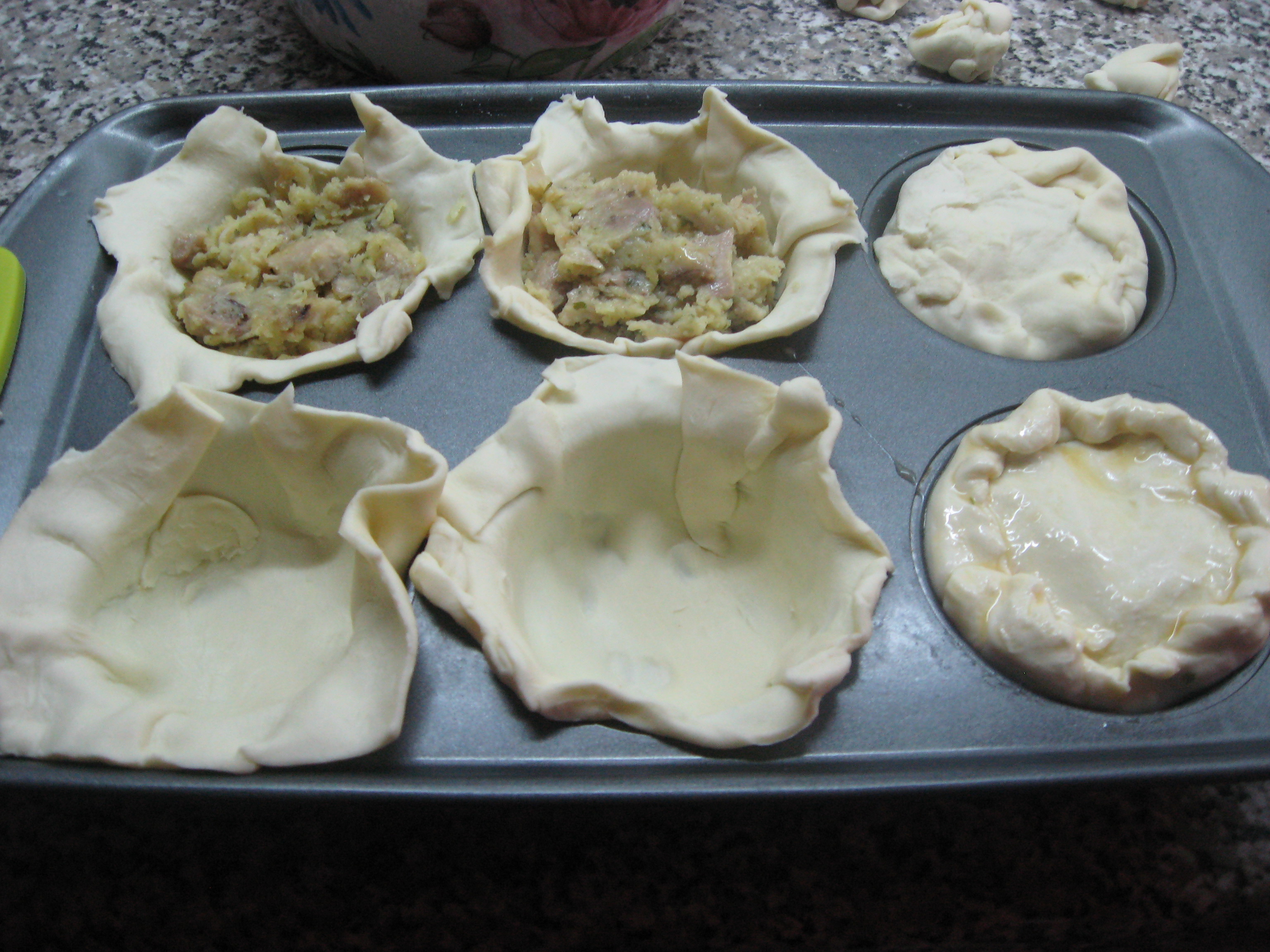 Cortar cada massa folhada em 8 porções, dispor nas formas, e cortar os bicos excedentes para tender e fazer a tampinha para a empada