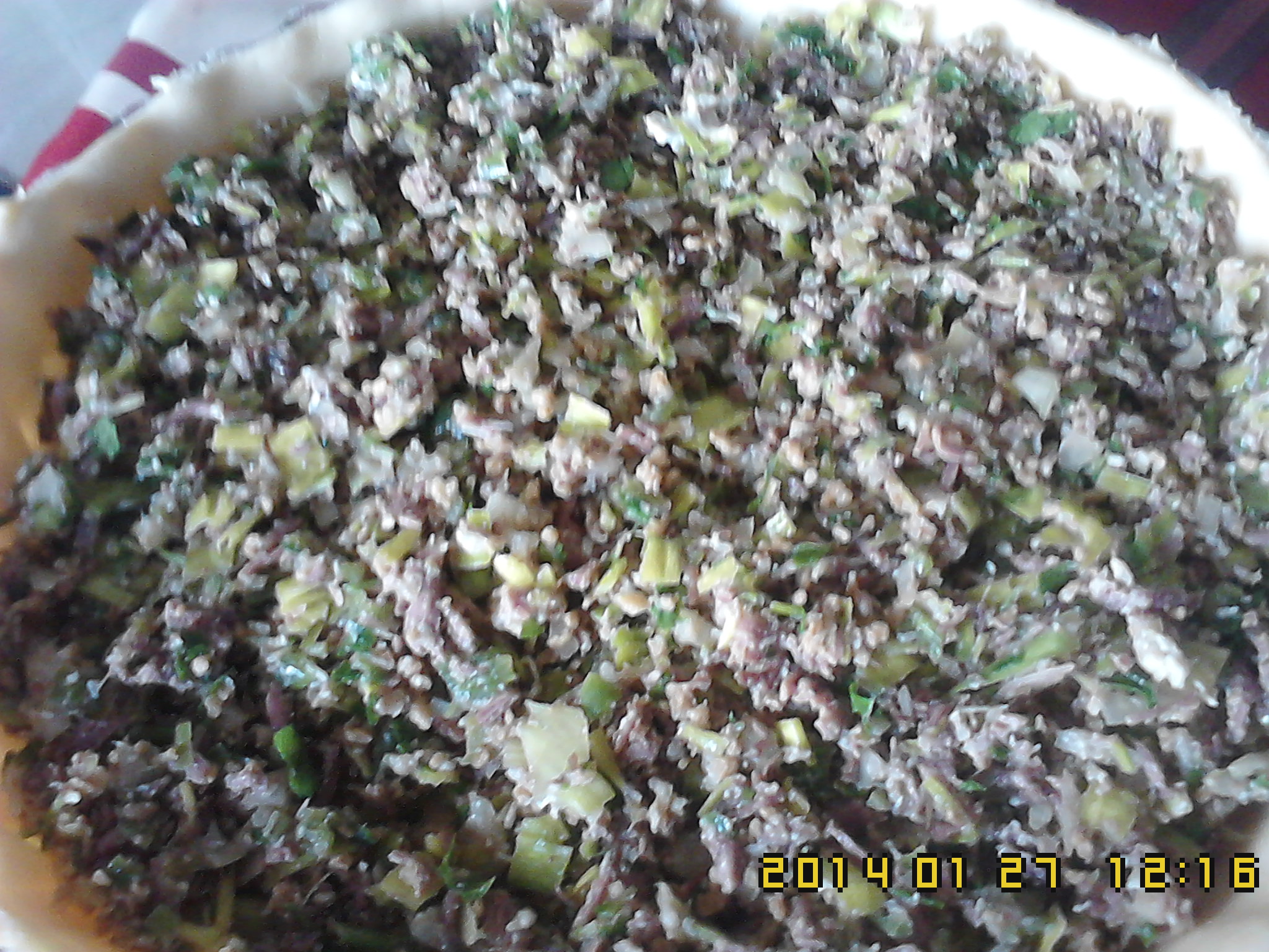 2)Sem lavar o copo,ponha o alho francês,cebola,pimento verde,carne de vaca grelhada,cortada aos bocados,salsa,soja,cóuco,azeite.Tirture,5s-V5.Coloque na base, espalhe com a espátula.
