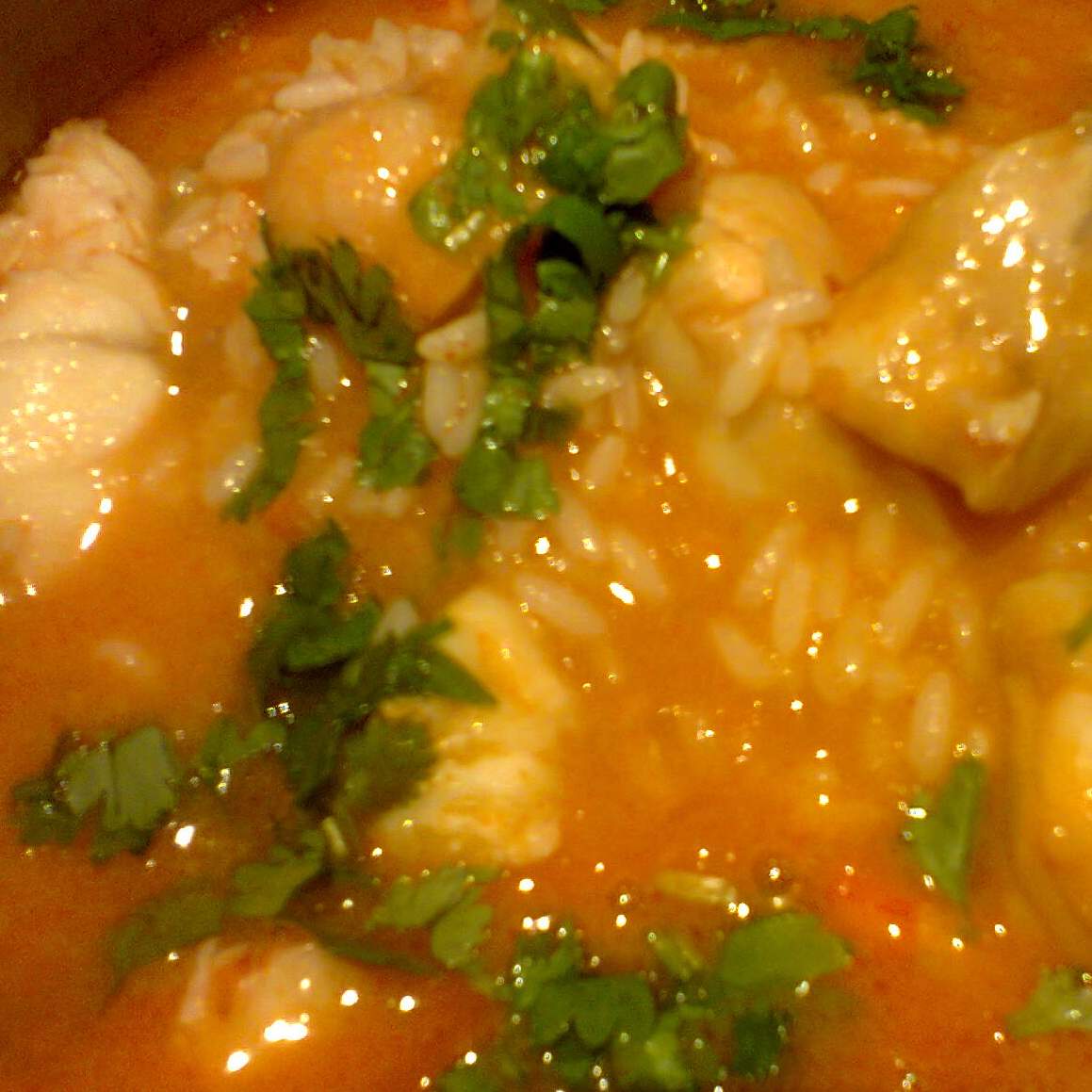 Depois de verificar se o arroz está bem cozido, deite para um tacho/pirex e junte o arroz, com o peixe/camarão e deite coentros previamente picados.