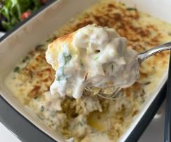 Dispor o bacalhau com legumes numa travessa e reservar. - Sem limpar o copo, juntar o leite, a manteiga, a farinha, o sal e a pimenta e programar 6 minutos, 90ºC, velocidade 4. Juntar as natas e programar 30 segundos, velocidade 3.