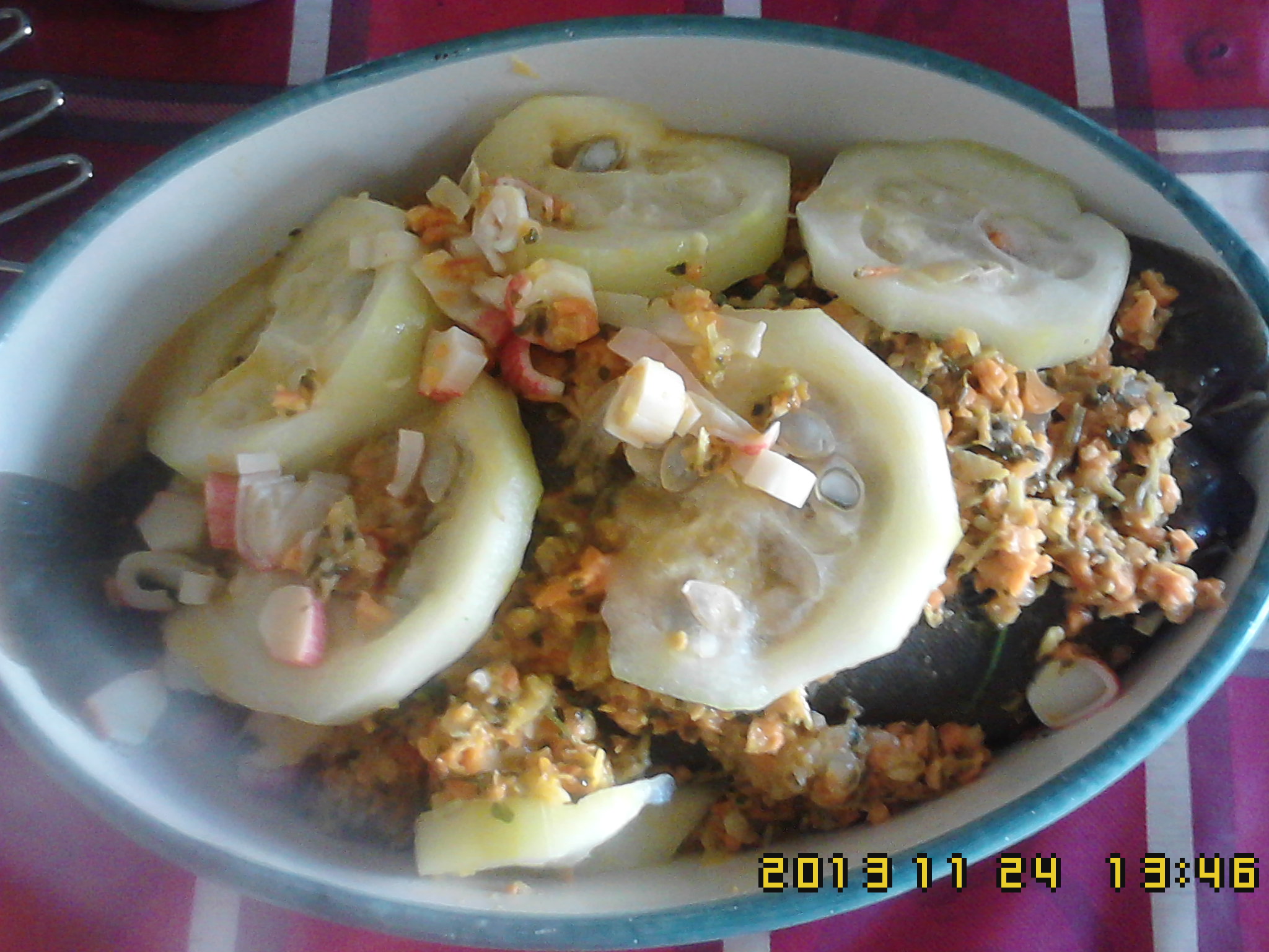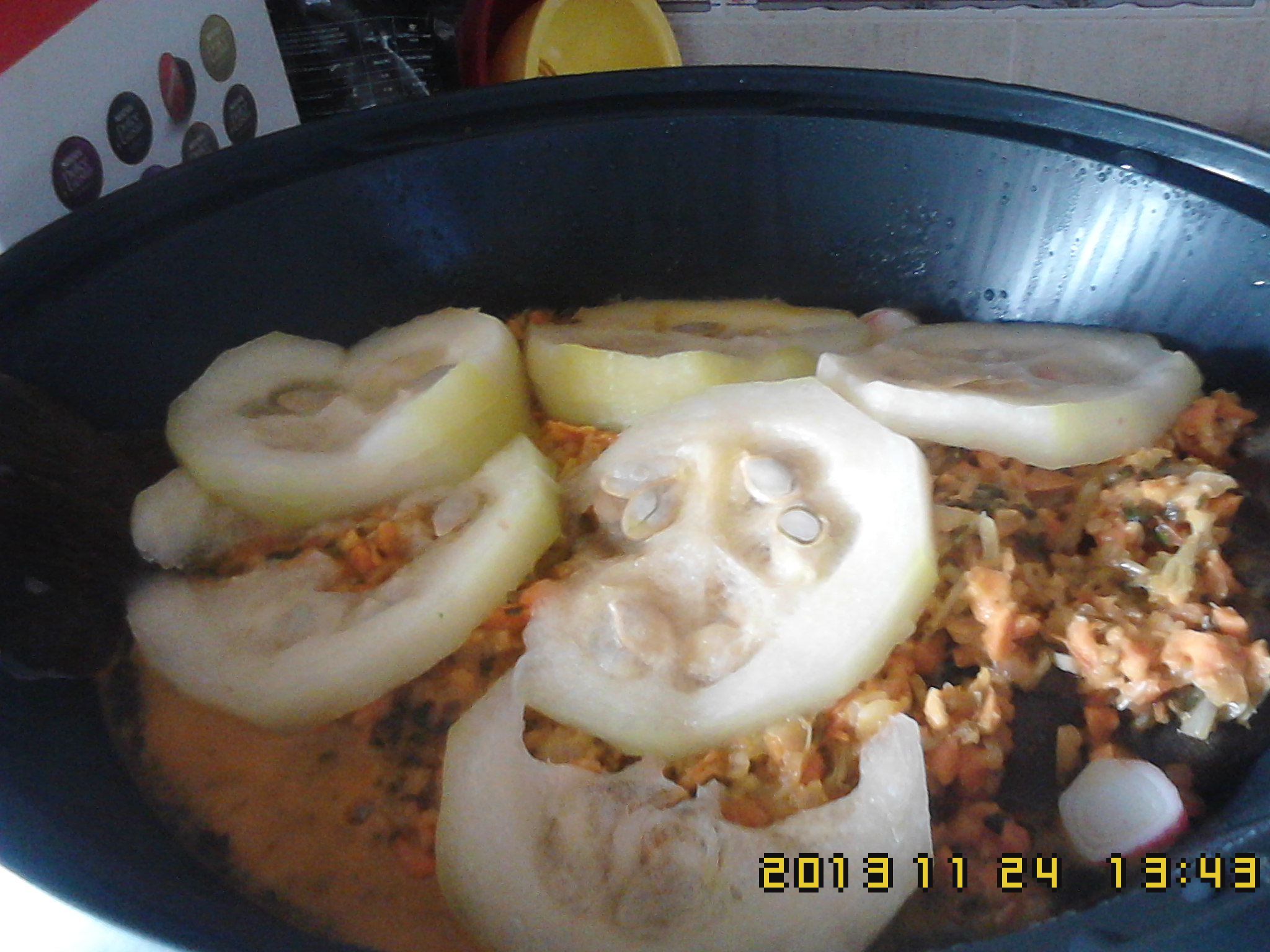 4)Na parte final, ponha os curgetes, (cortar em rodelas finas).50m-V2-100C. Quando desligar a bimby, deixe mais 10m.
