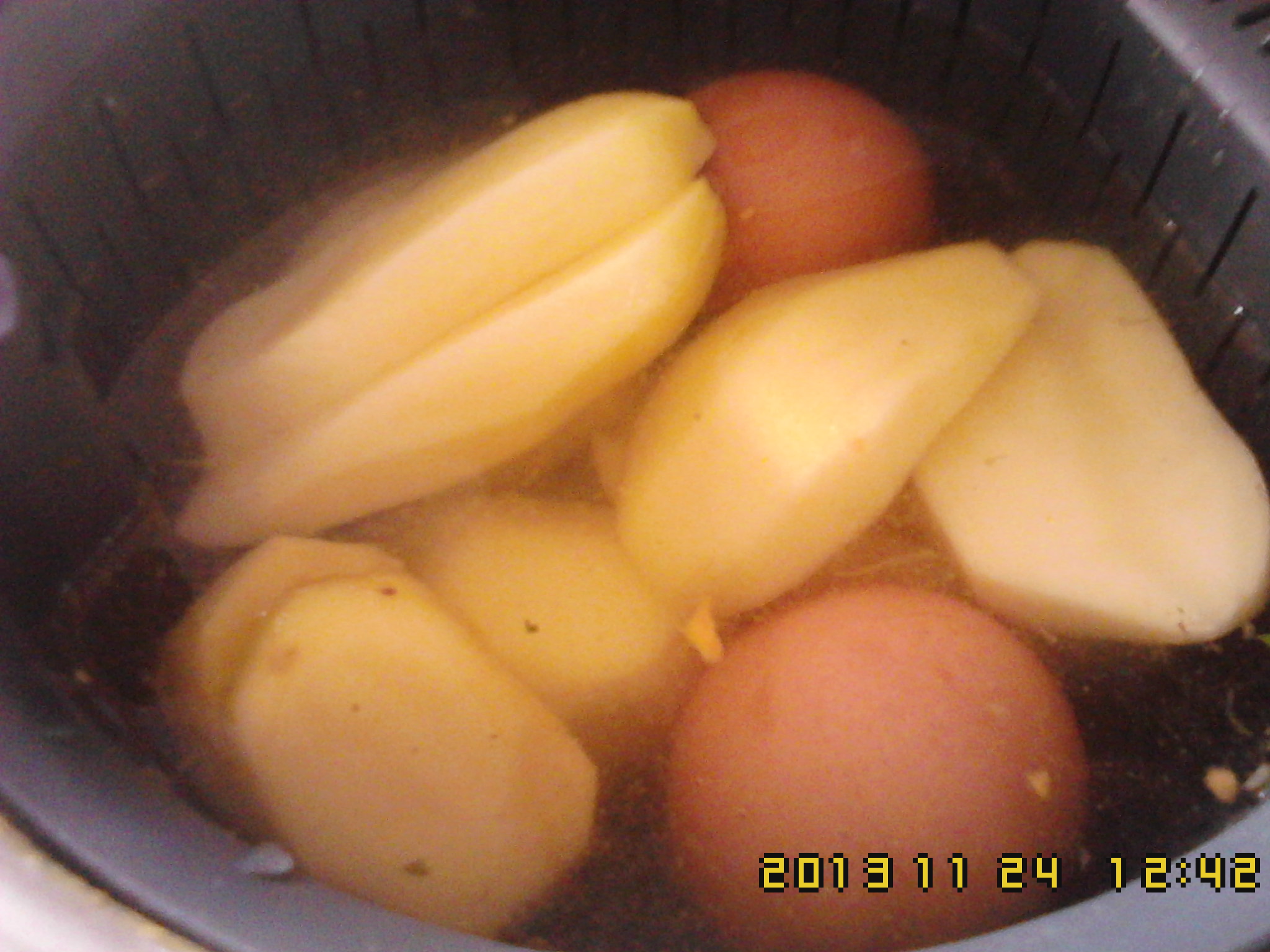 2)Sem lavar o copo ponha a água, o cesto com os 4 ovos e as batatas, tape e coloque a tampa varoma.