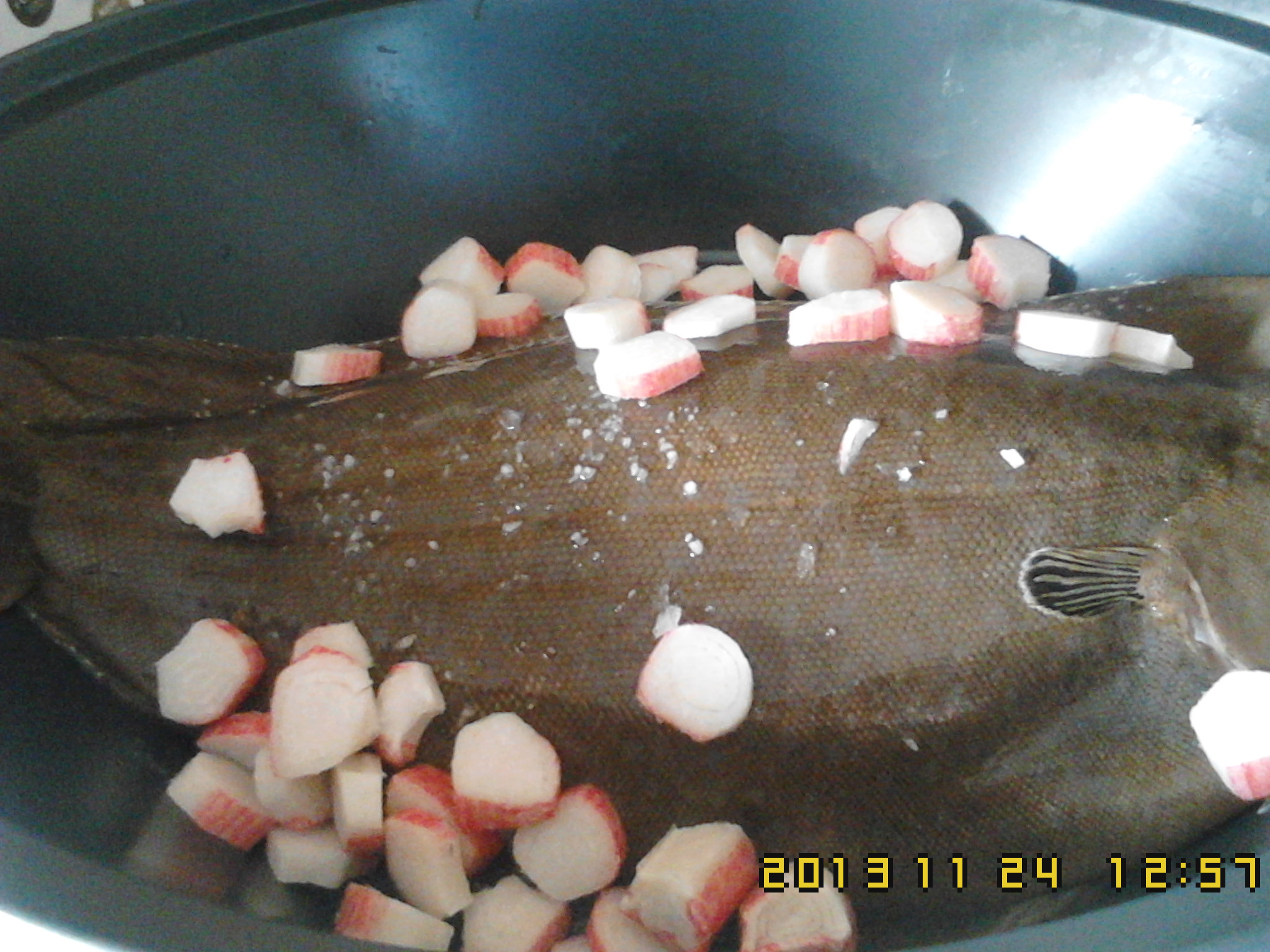 3)Na varoma, folha de loiro, os línguados, cortar as delicias do mar finas em cima dos línguados, ponha também o refogado.