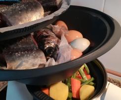 - Finalizado o tempo, desmontar a varoma com cuidado, pois durante a cozedura ganha água em redor do peixe. Retirar os legumes, descascar os ovos e está pronto a servir.