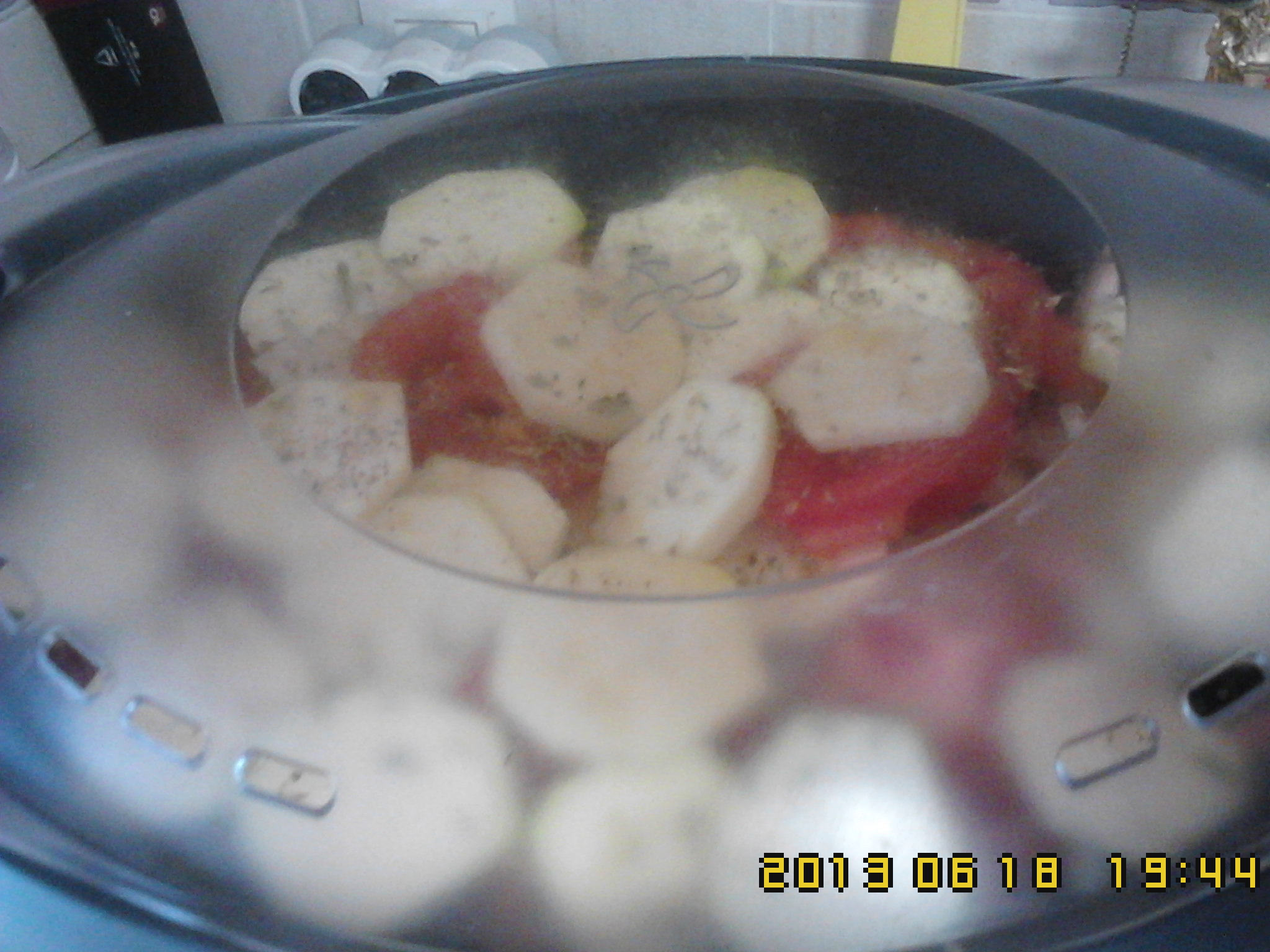 1-No copo um litro e meio de água.No cesto quatro batatas médias cortadas em 4 partes,4 ovos,fechar o copo.2-Na tampa varoma por em baixo o ramo de hortelã,a folha de loiro.3-Colocar a pescada em postas em cima,do loiro,hortelã.4-Por o sal,cortar as 2 cenouras,cada uma cortar em 4,por ao lado da pescada,cortar a metade da cebola ,em rodelas finas,coloque em cima da pescada.5-Exprema,metade do limão,em cima da pescada,corte os alhos, tomates rodelas finas,ponha em cima da pescada.6-Corte o curgete em rodelas finas,coloque em cima da pescada,juntamente com o caldo de peixe em pedaços pequenos,espalhe na pescada.7-Coloque o azeite,uma pitada de pimenta preta,com os oregãos,espalhados pela pescada.V2-varoma 45m.Pronto a servir.