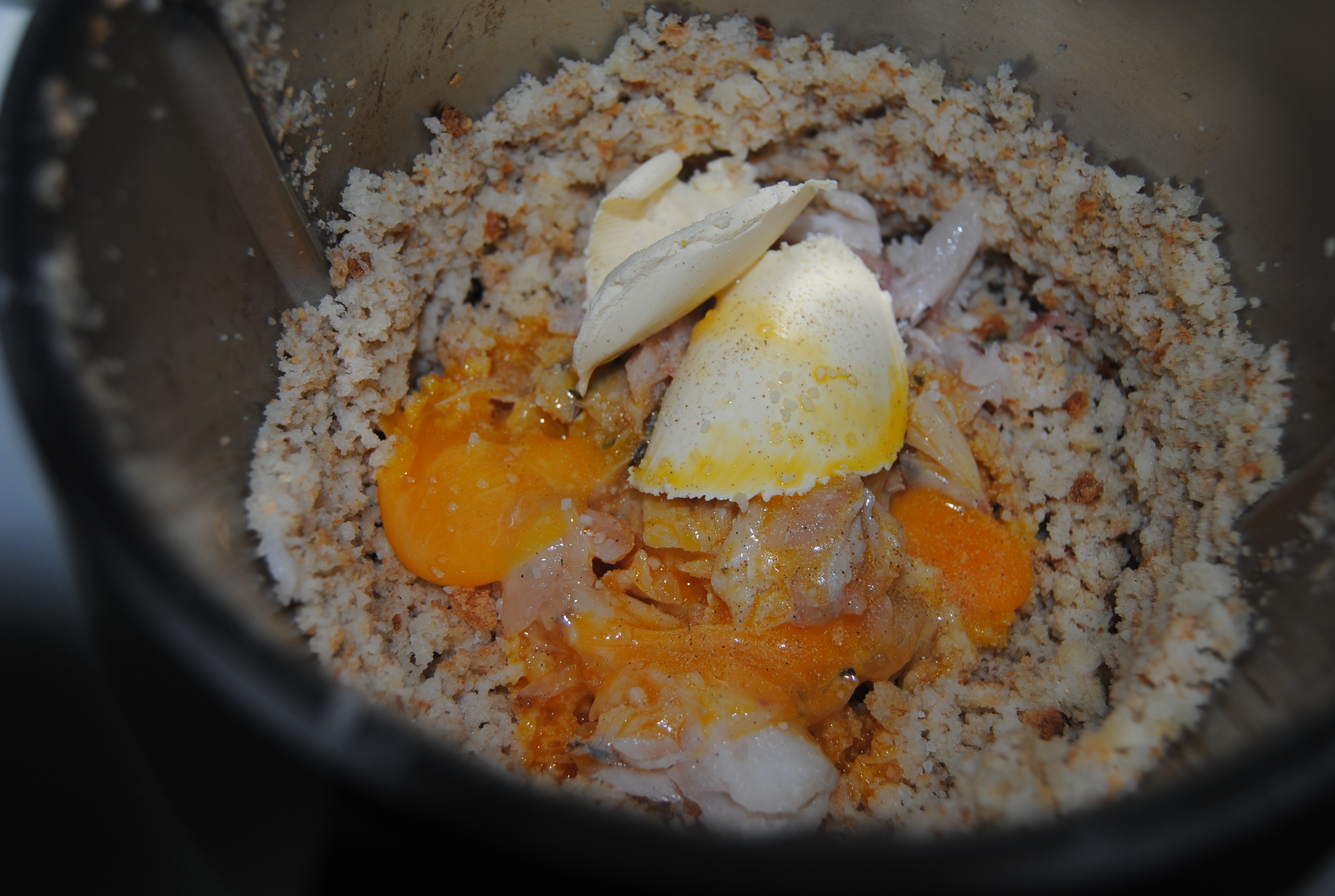 Juntar o peixe desfiado, as gemas, a manteiga o sal e a pimenta, 6 s na velocidade 3.