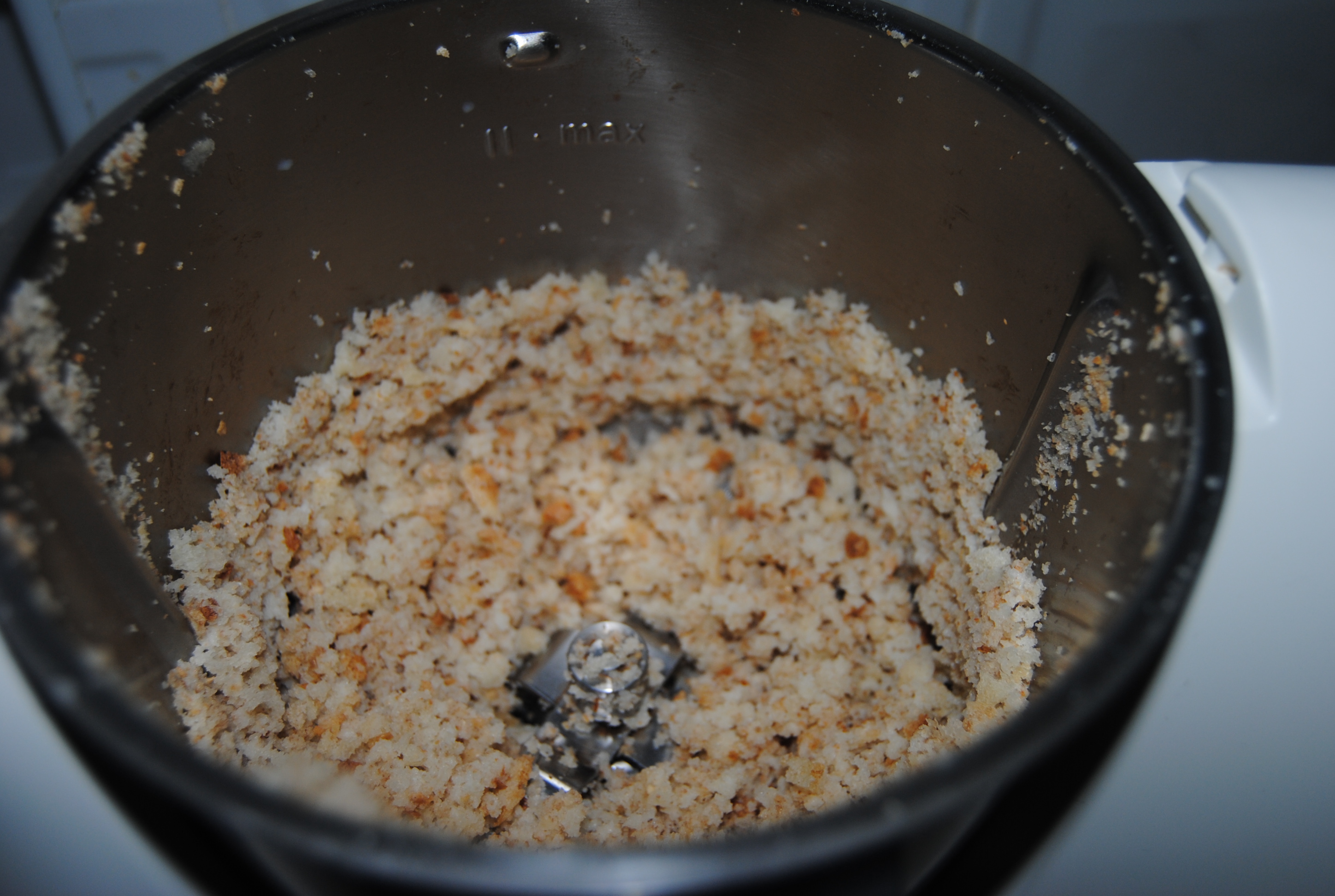 Colocar o pão em bocados no copo e picar 10 s na velocidade 4-7-9.