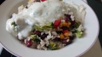 5. Coloque numa taça o arroz, os brócolos o milho, o azeite, o vinagre, o feijão, a amendoa, os cogumelos o pimento e envolva bem. Acompanhe com o molho de iogurte.