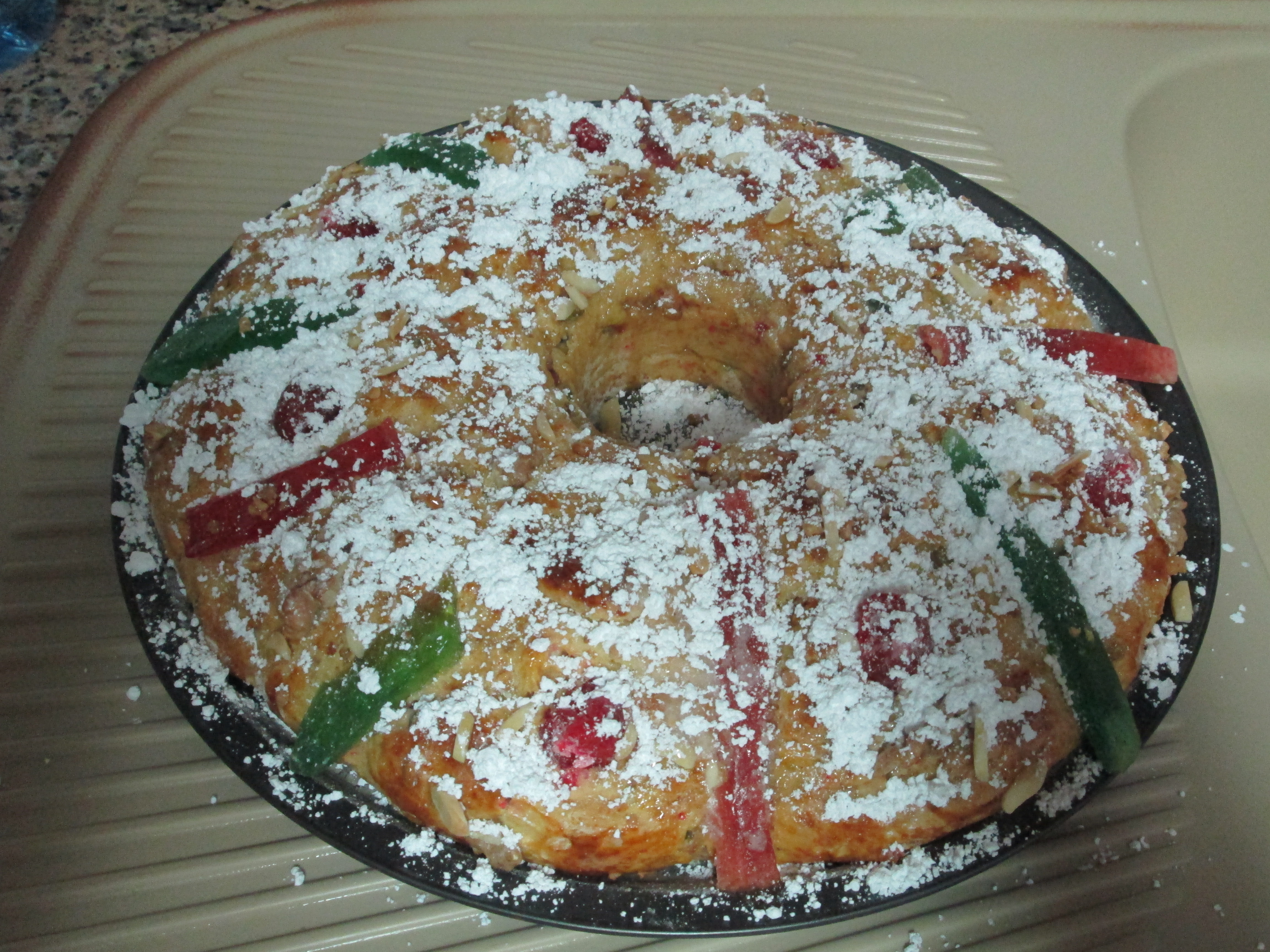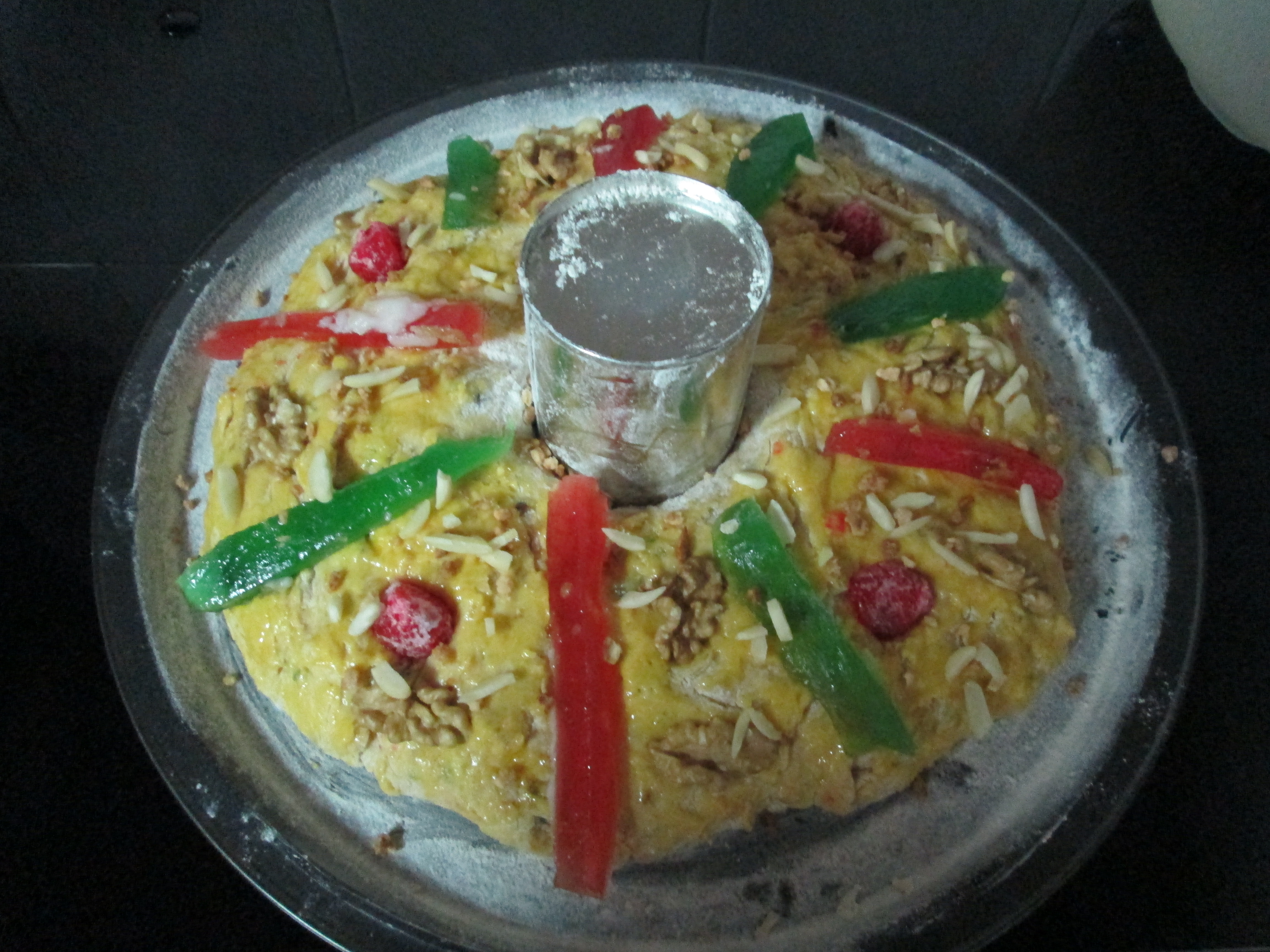 , junte então a fruta cristalizada e os frutos secos, aproximadamente 350g, através do bocal da tampaRetire a massa do copo. Amasse com as mãos até formar uma bola lisa, polvilhando a mesma com farinha. Dê-lhe a forma de uma rosca e coloque-a num tabuleiro previamente untado com manteiga e polvilhado com farinha