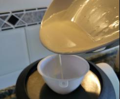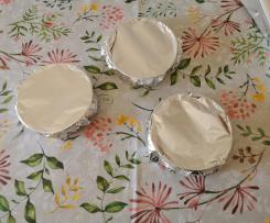 - - Deitar o preparado para as taças (6 taças aprox.) e tapar com papel de alumínio, colocar as taças na varoma (com o separador). No meu caso as taças são baixas e largas e não cabem todas na varoma, por isso tenho de repetir o passo seguinte (cozedura) mais uma vez. Se também tiver de repetir o processo de cozedura para as restantes taças, não se esqueça de repor as 1000g de água;