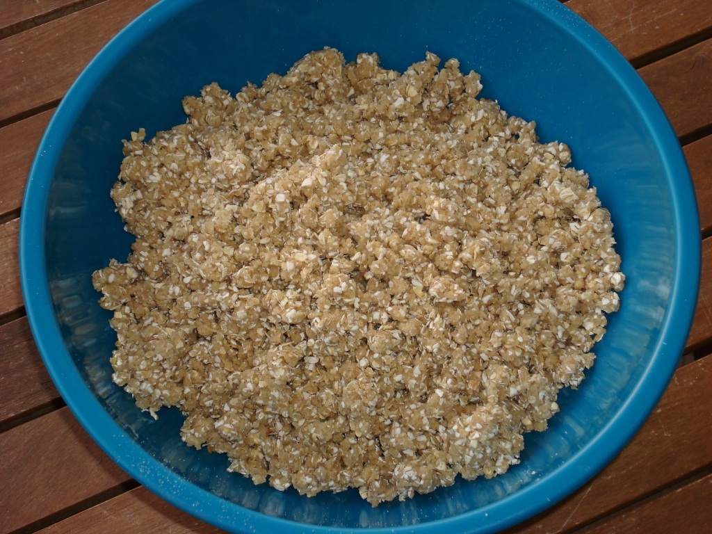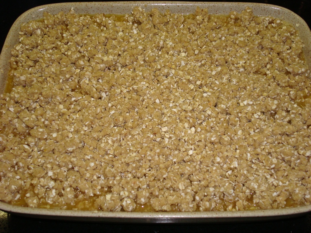 7. Num tabuleiro de ir ao forno, colocar a mistura de maçãs e pêras e, por cima desta, o crumble reservado (sem calcar, ficando com o aspecto de migalhas grossas).