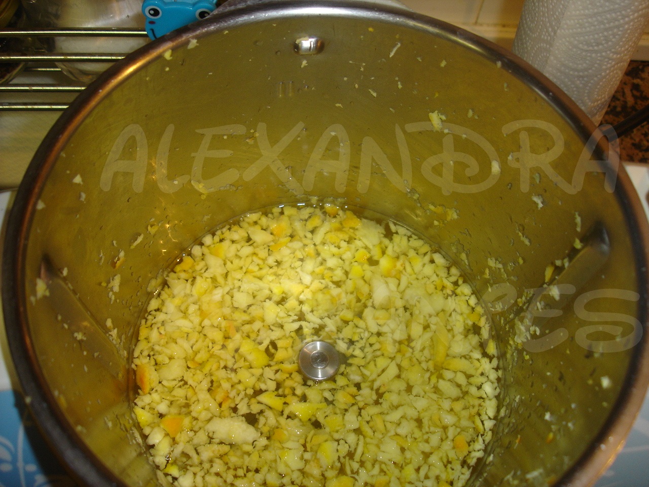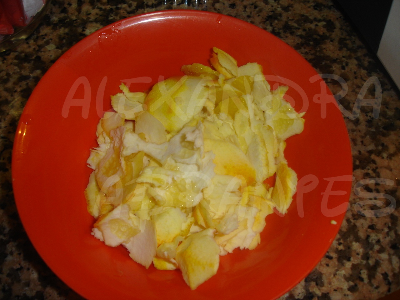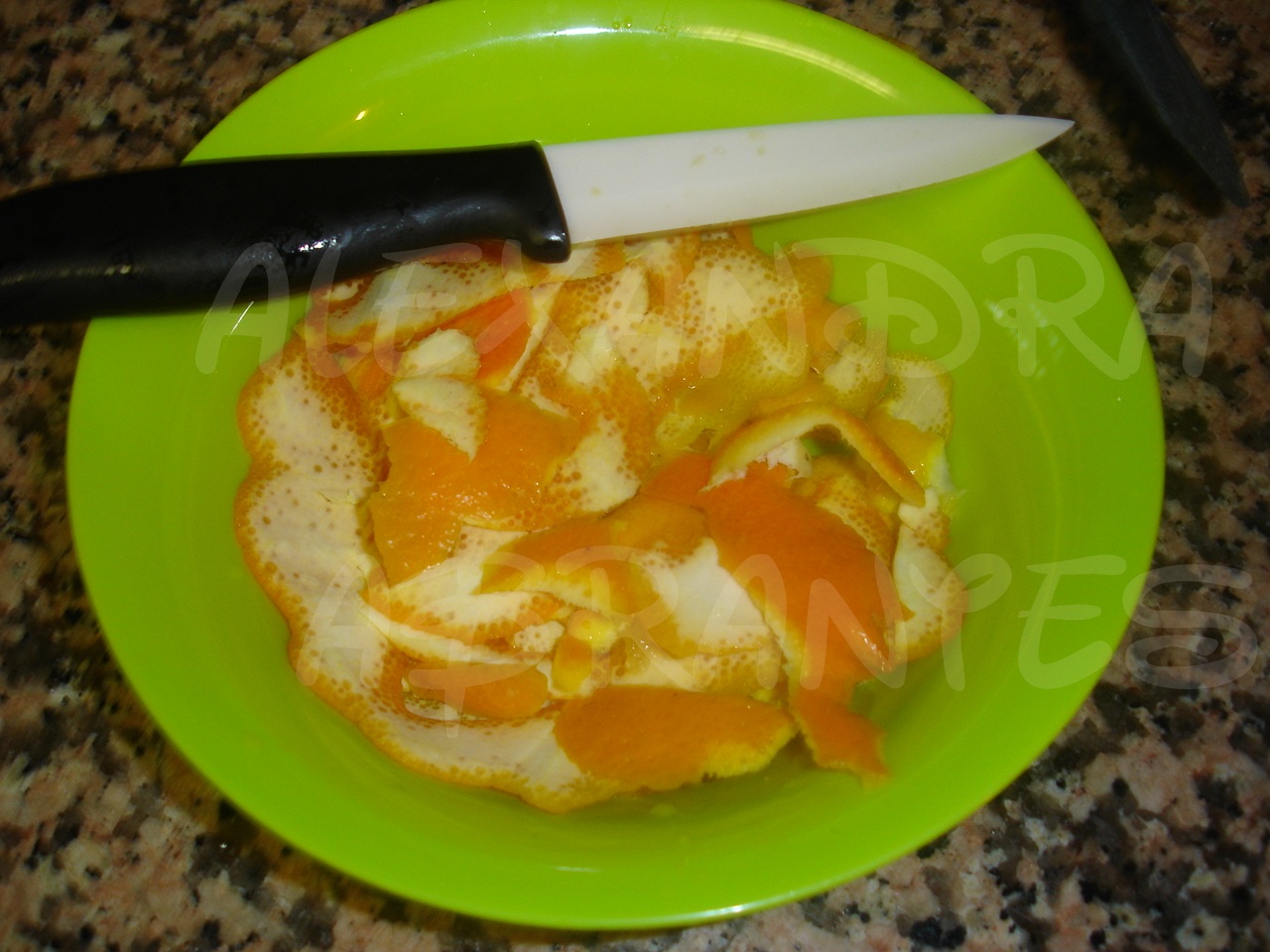 Colocar no copo a pele branca da laranja e dar uns golpes de turbo. Juntar a água e o sumo de limão e programar 7 minutos, temperatura 100º, velocidade 2.