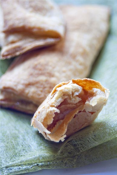 Pincele o contorno do rectângulo com água e feche, pressionando as bermas. Dobre novamente ao meio sobre si mesmo, formando um pequeno rolo.