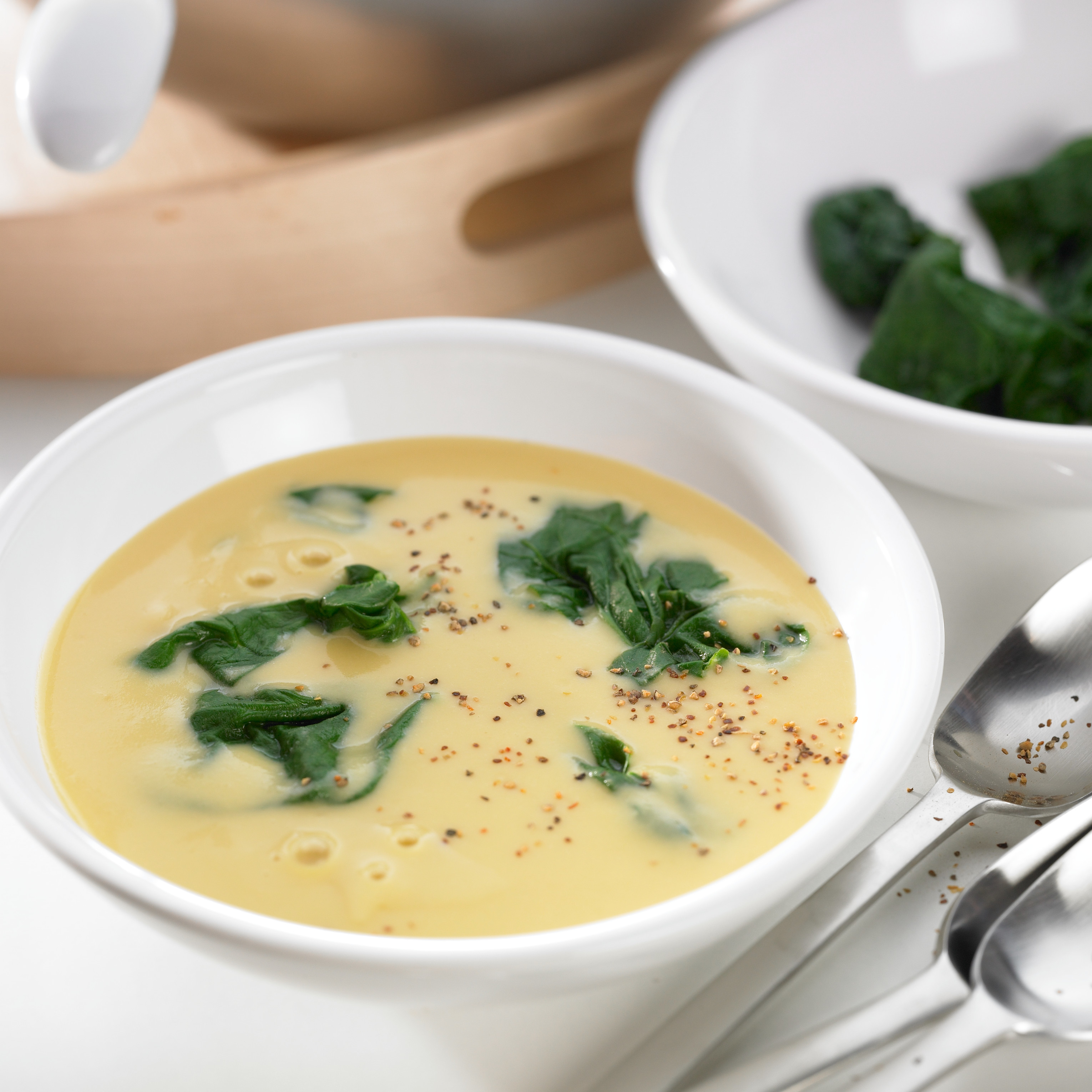 - Coloque os espinafres numa taça, deite a sopa sobre estes e tempere com sal e pimenta a gosto. Misture e sirva quente.