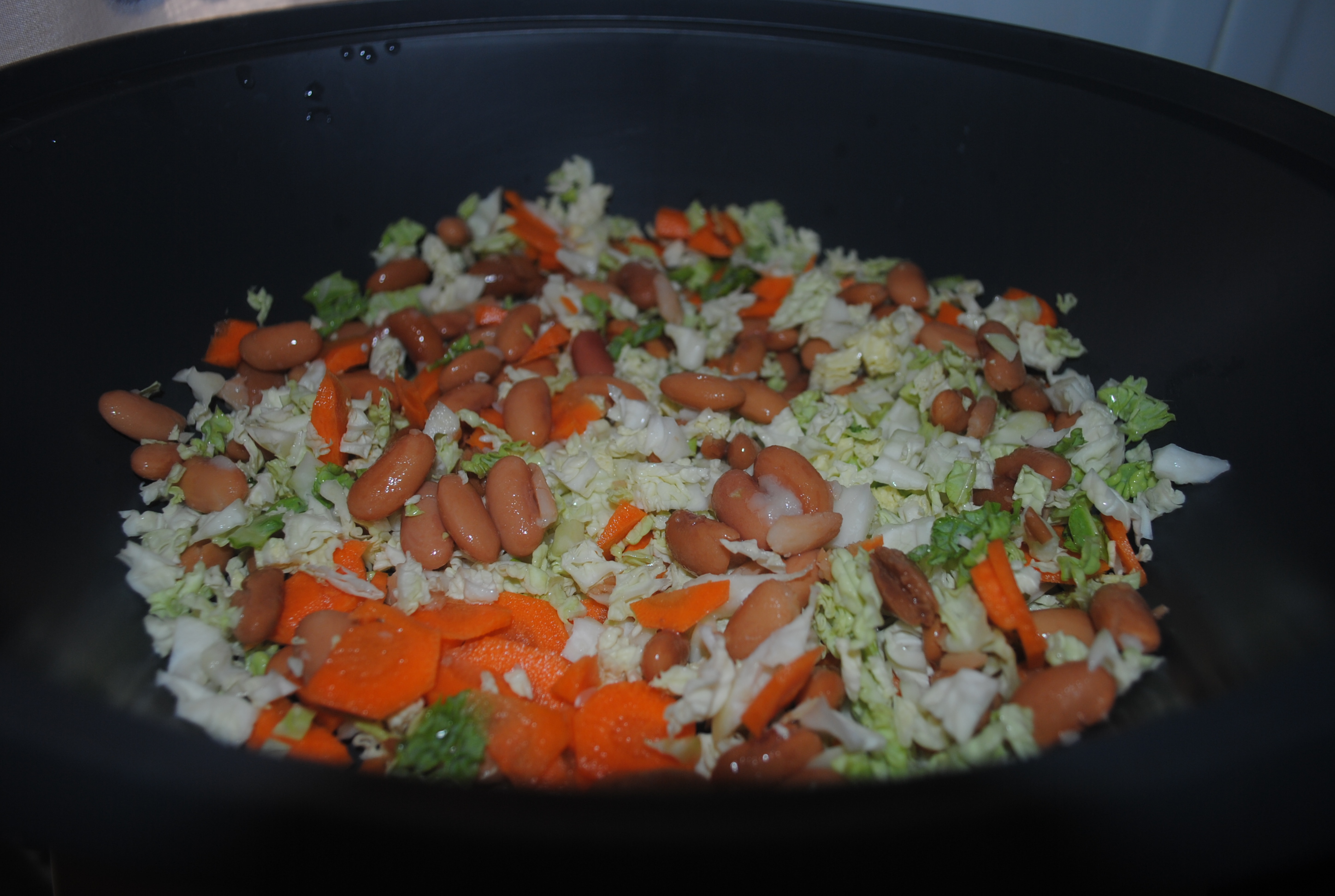 Na varoma colocar uma parte do feijão, a cenoura, o repolho e o arroz.