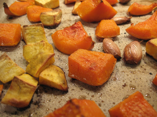 Coloque num tabuleiro de forno a abóbora, a batata-doce e os dentes de alho (com casca) temperados de sal e regados com um fio de azeite. Leve ao forno cerca de 20 minutos.